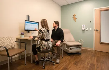 The imminent adoption of a more accessible electronic medical record provides opportunity for improvements in collaboration, care coordination, patient scheduling and room utilization. Dual access exam rooms and supporting technology provide patient self-rooming opportunities and efficiencies for a new integrated care team model. Behind the scenes contiguous exam pods are connected so that staff can flex to support varying levels of clinic activity.