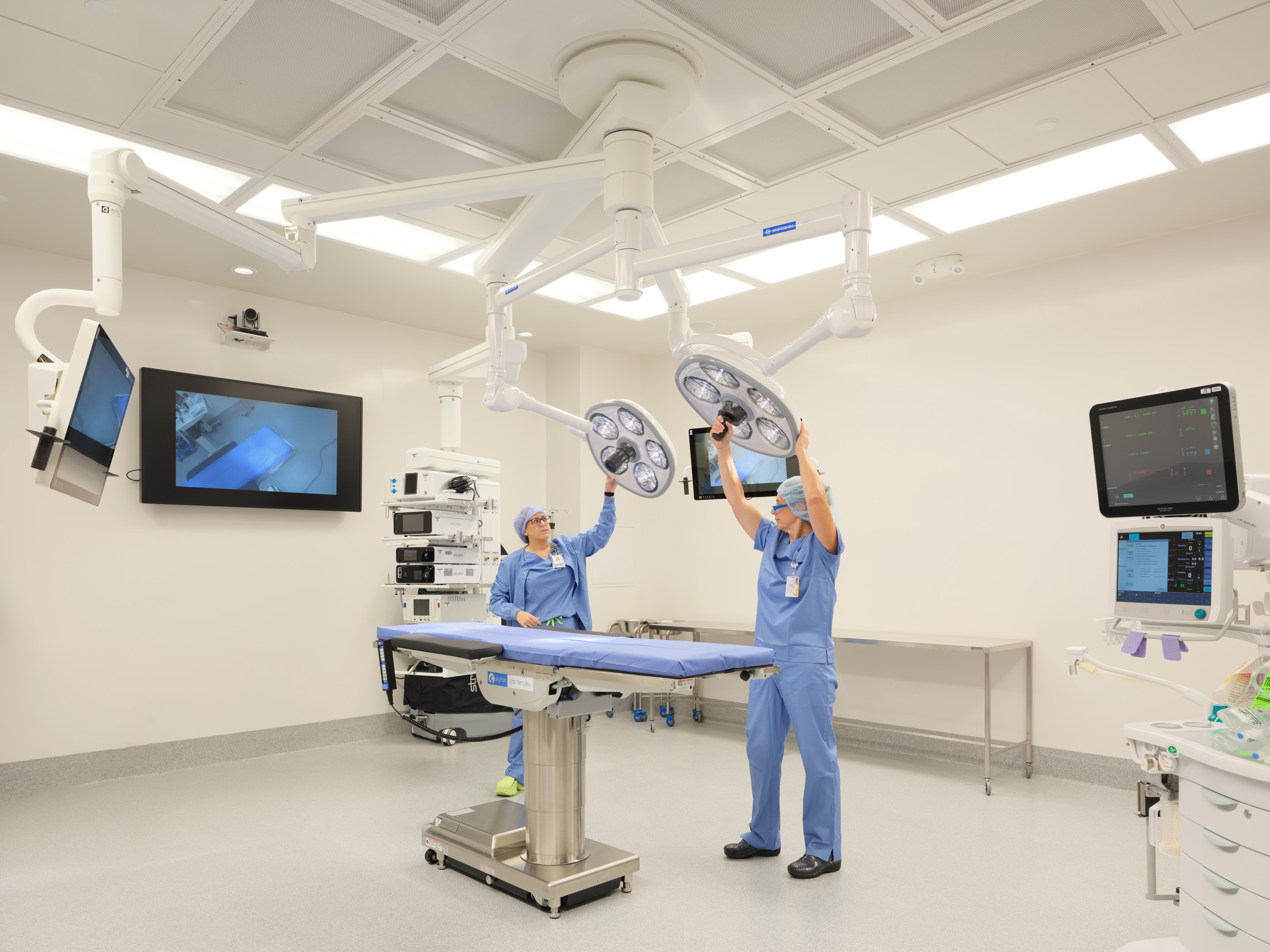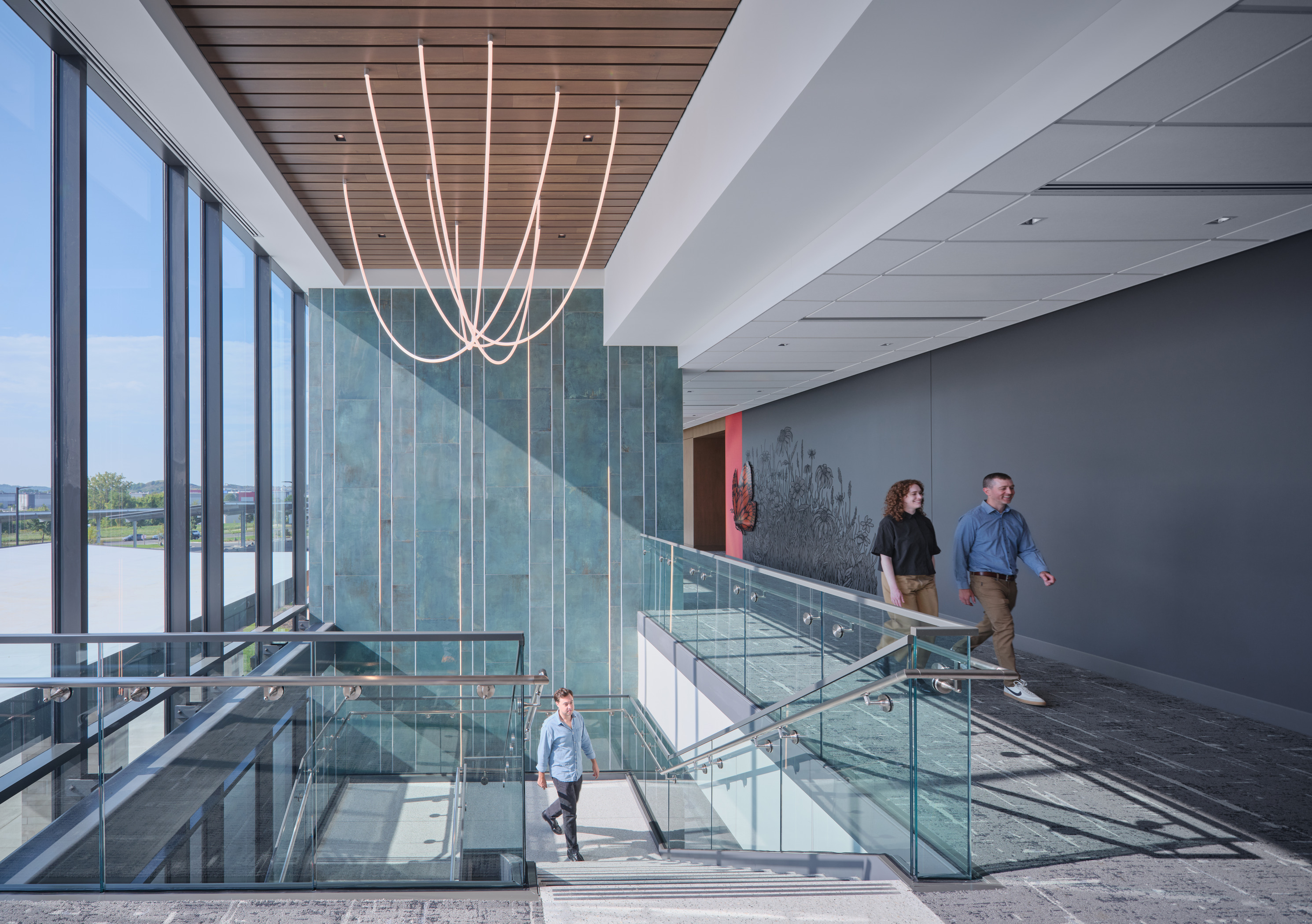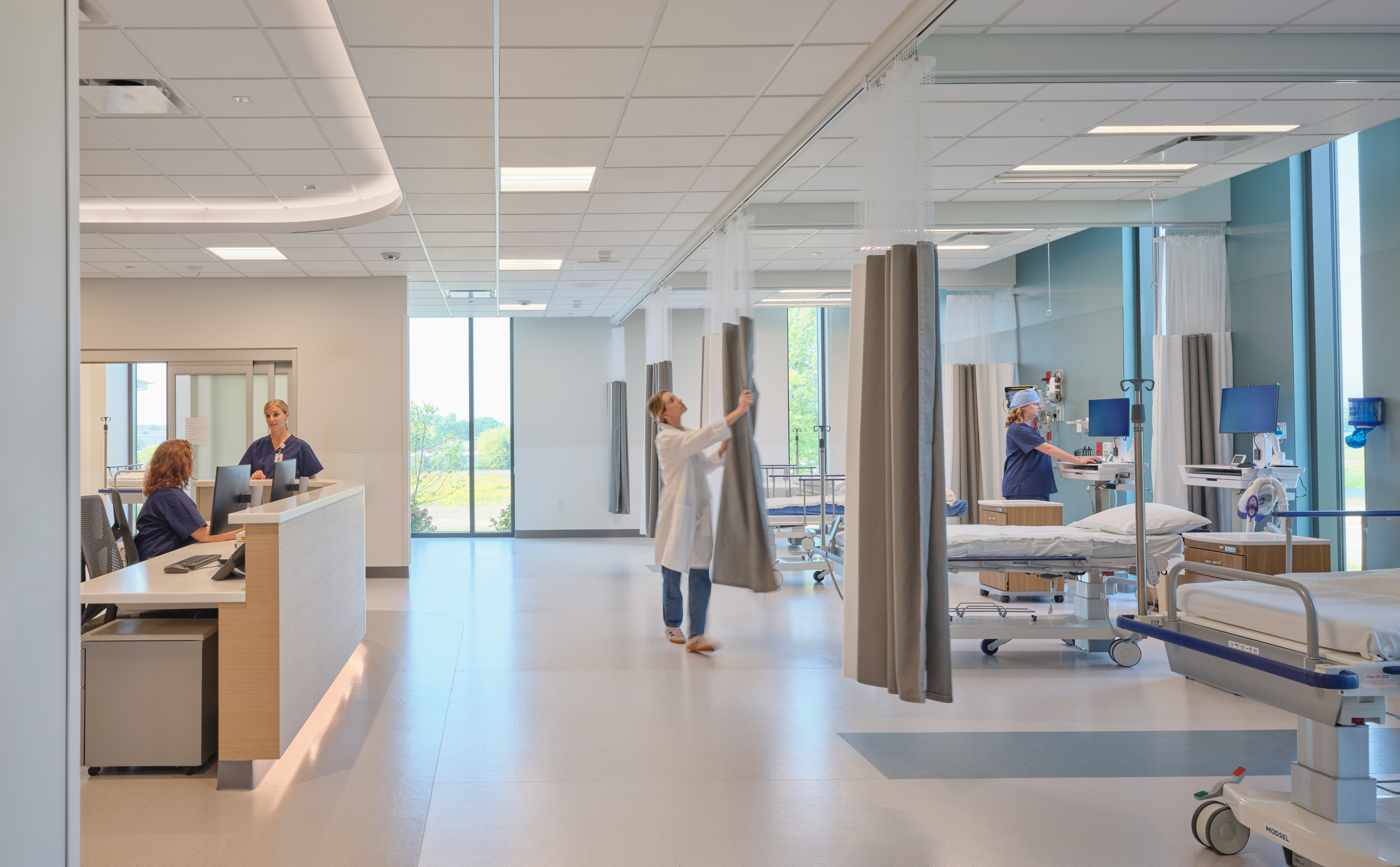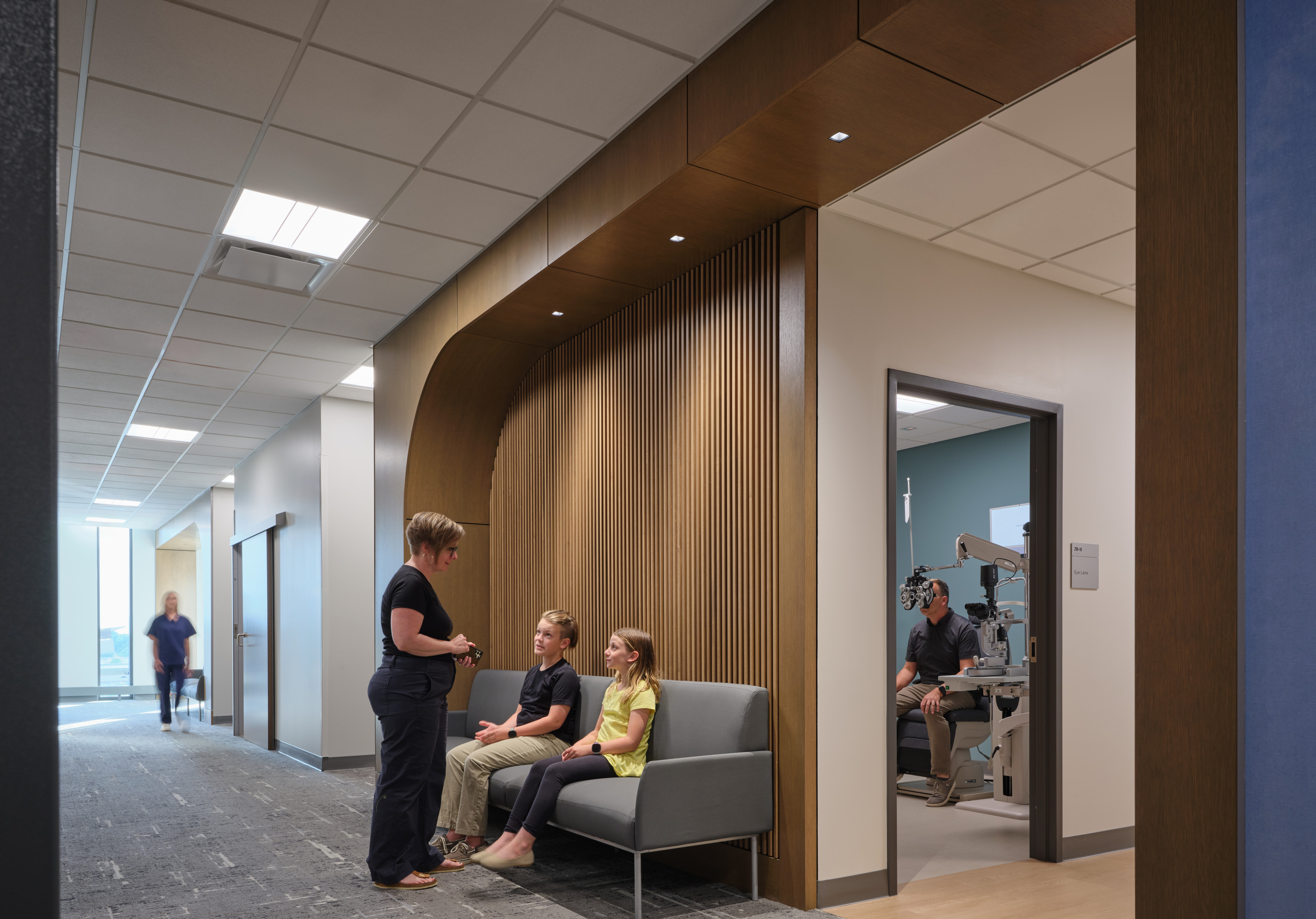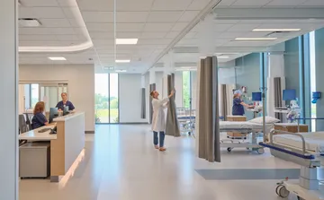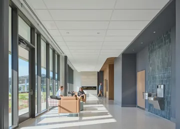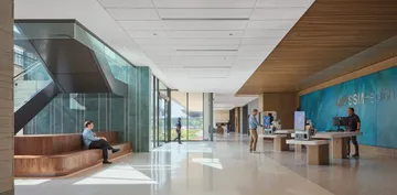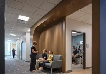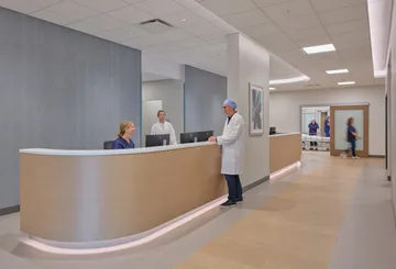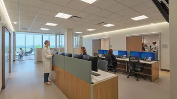 A solar array built as carports will provide shaded and covered parking for patients and staff. The arrival space prioritizes technology implementation that can evolve and aligns with consumer expectations today and an improved patient experience. The lobby features a monumental open stair to the Second Floor where patients will self-room and staff are in an off-stage integrated care team hub that improves operational efficiency and encourages cross collaboration.