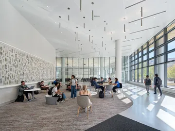 The building is organized to enable three key ecosystems to flourish together—a Research Ecosystem, a Learning Ecosystem, and a Student Ecosystem. A flexible community space, connected across several levels of the building, creates visual and physical connections. This space is punctuated by collaboration spaces and specialty research spaces to promote connection and to celebrate the research life. The design is intended to facilitate intellectual collisions—across Departments and campus, between faculty and students, and across the institutional boundary—that underlie the CDIS mission.
