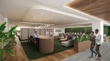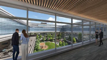 Employee well-being is central to the design, with upgraded amenities including a reimagined wellness center, refreshed dining and café spaces, and enhanced outdoor courtyards. Sustainability strategies are embedded throughout, including material reuse, energy-efficient systems, and high-performance building upgrades.