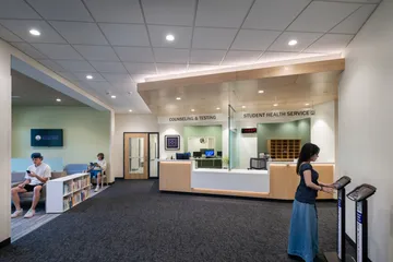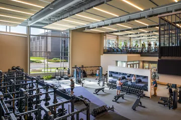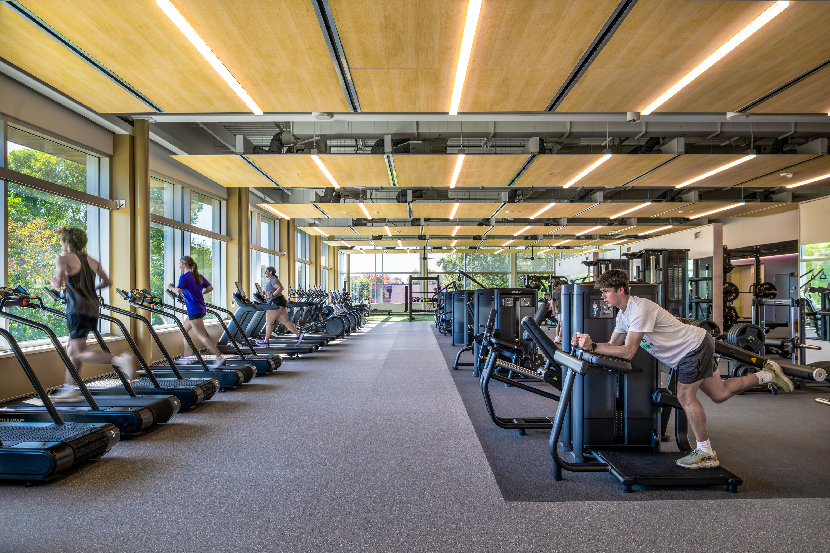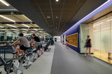 The design thoughtfully integrates all programs into one coherent experience in order to support awareness of all aspects of health and wellness. The main entry is surrounded by a large, 2-story wellness center that includes cardio, weights and functional fitness areas. Student Health Services, along with the Counseling Center are also located directly off of the main entry. Group exercise studios and a large multi-purpose gymnasium are located on the second level.