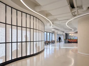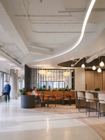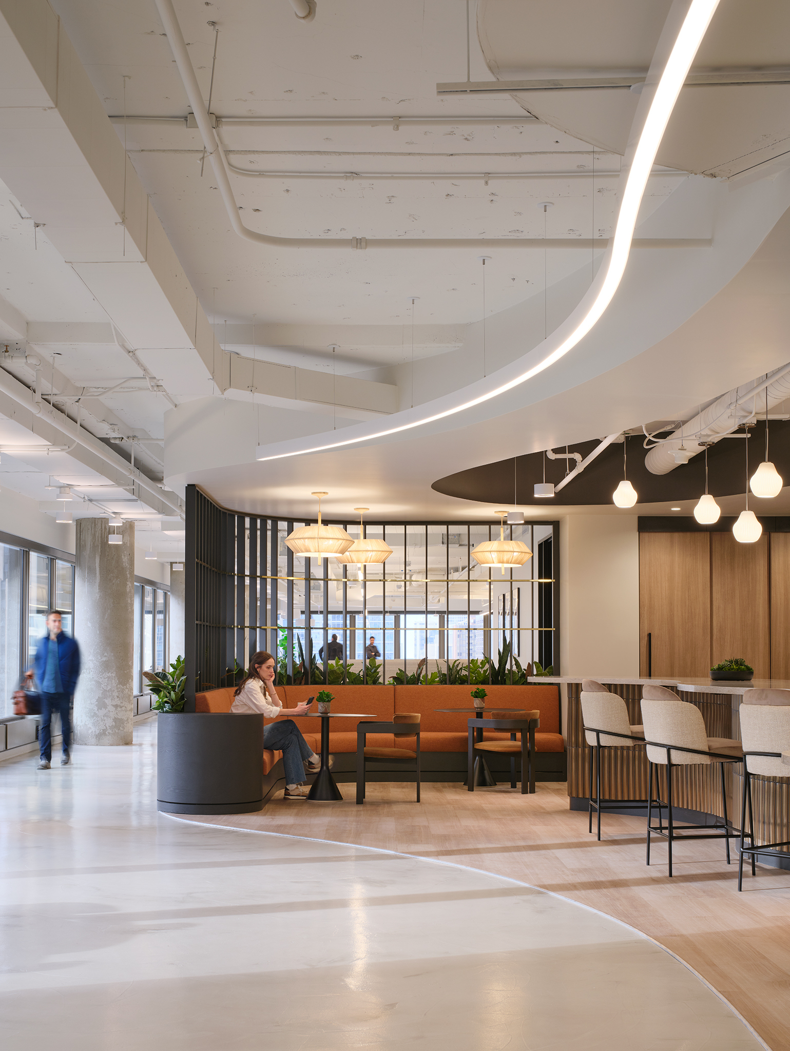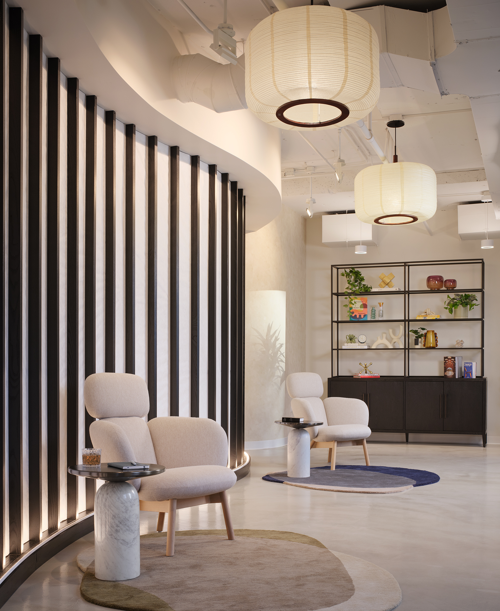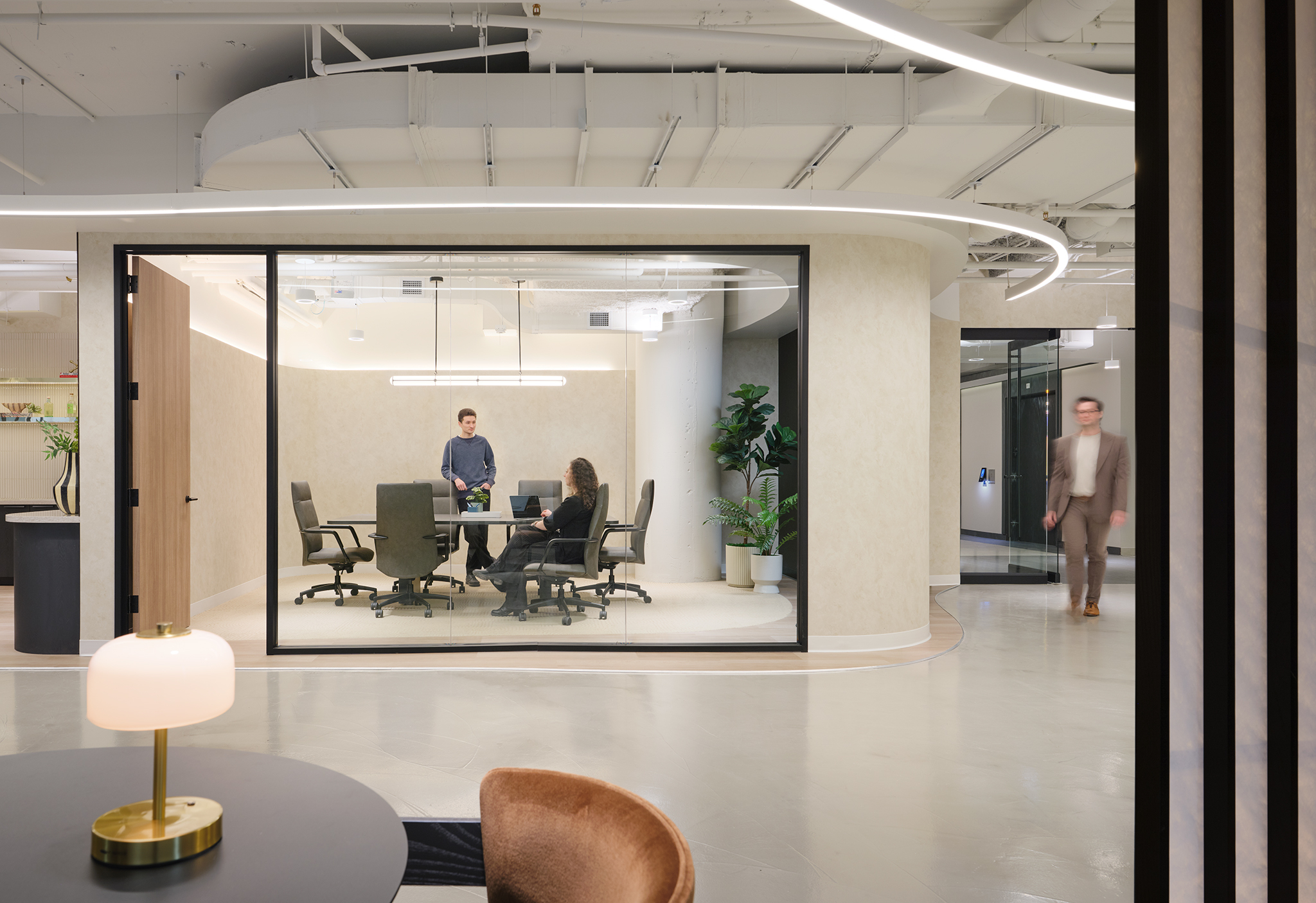 Upon arrival, a custom curved Shoji screen gently welcomes guests, guiding them along softly rounded pathways that encourage exploration and a sense of calm, creating a memorable first impression during tours. The suite is intentionally designed to balance beauty and functionality, offering a refined, move-in-ready environment that allows tenants to easily envision their brand within the space.