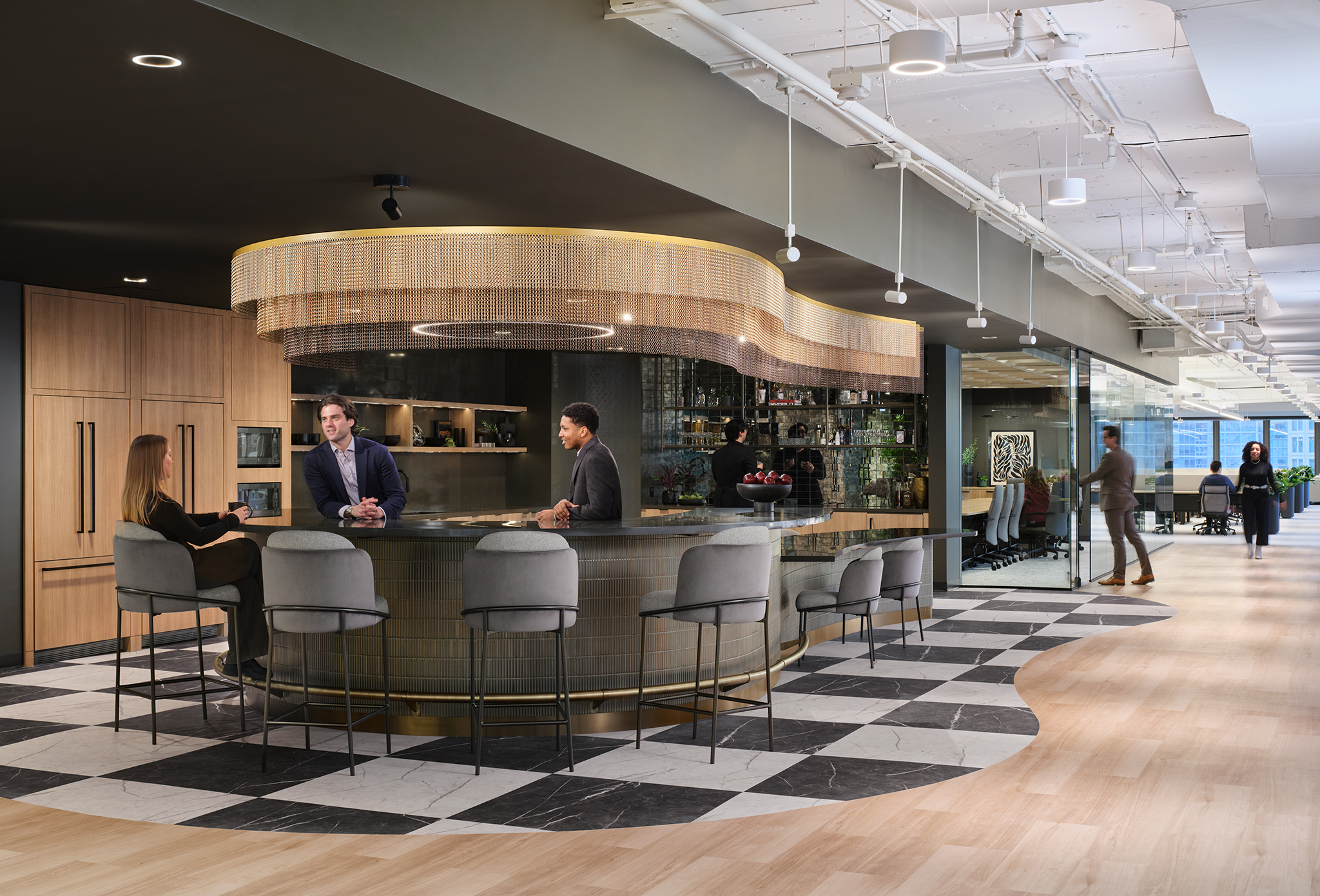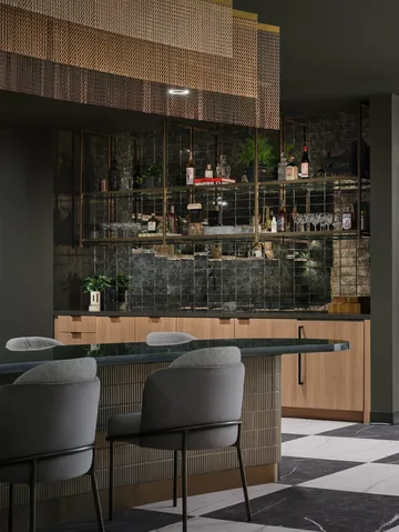 The suite, “Scala,” takes its name from the Italian word for “stair” or “scale,” symbolizing elegance and progression. Its design channels the warmth and sophistication of a modern Tuscan-inspired retreat. Rich medium wood tones, classic checkered flooring, antique mirrored backsplashes, and bronze metal accents come together to create a space that feels both luxurious and inviting. Plush seating and quartz surfaces add tactile richness, while the deep, saturated palette fosters a sense of intimacy and belonging - an environment that feels curated, not constructed.